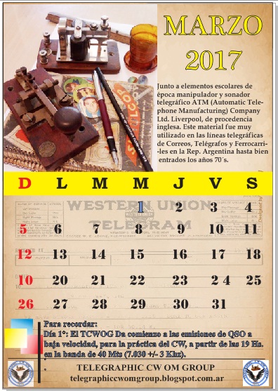Nuestro secretario general Fernando Arias España nos acercó gentilmente el calendario cw para el mes de Marzo. Atención al 1ro de Marzo, fecha de prácticas a baja velocidad.